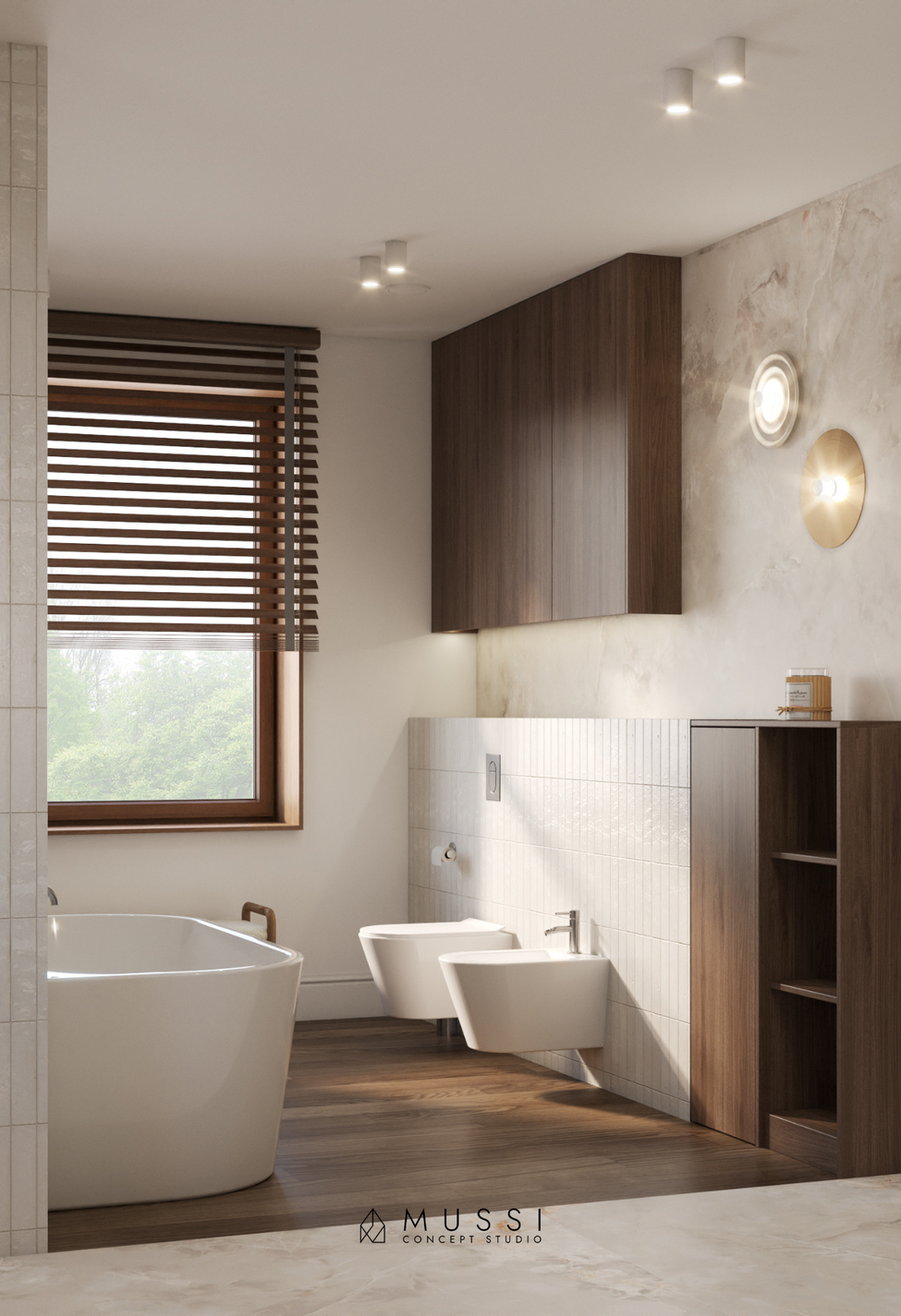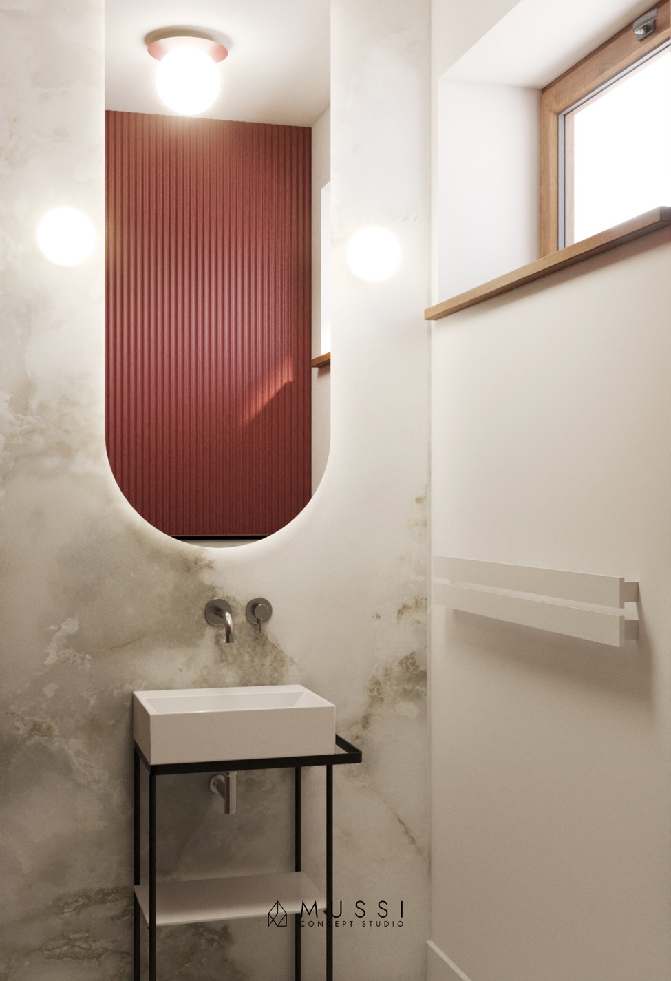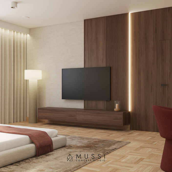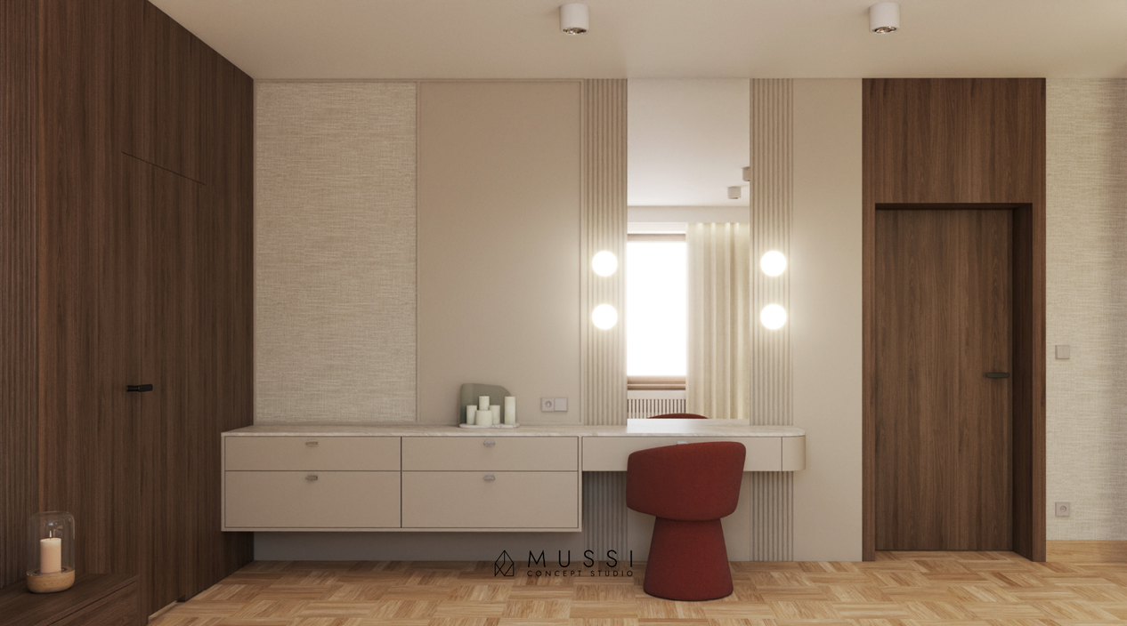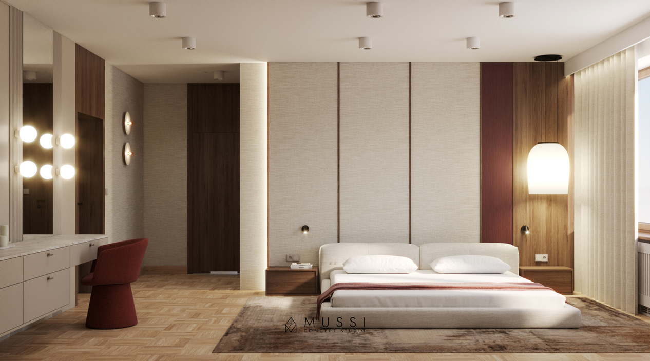 Monochromatyczną bazę drewna i beży przełamaliśmy odważnym, autorskim akcentem. Motywem przewodnim, nadającym wnętrzu unikalnego charakteru, jest głęboki, szlachetny odcień wina (bordo). Pojawia się on na fornirach w kuchni, w tapicerce foteli czy w detalu sypialni, budując atmosferę wyrafinowanej intymności. Zmysłowość wnętrza podkreślają tekstylia — wysokiej jakości tkaniny o splotach kaszmiru oraz naturalny len na ścianach, które sprawiają, że każdy dotyk i spojrzenie niosą ze sobą przyjemność. Całość dopełniają nowoczesne lampy, które niczym rzeźby w przestrzeni, przełamują klasyczny rytm zabudowy.