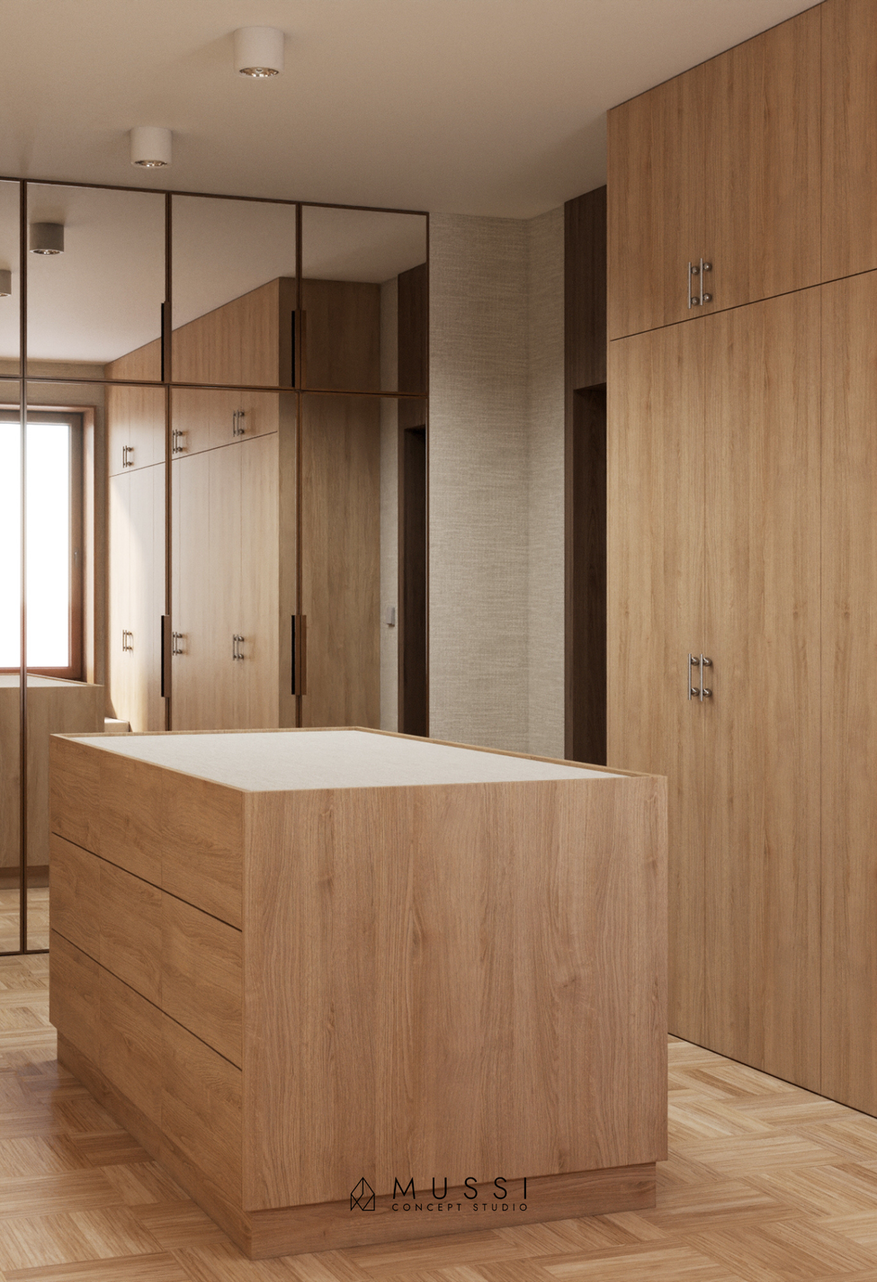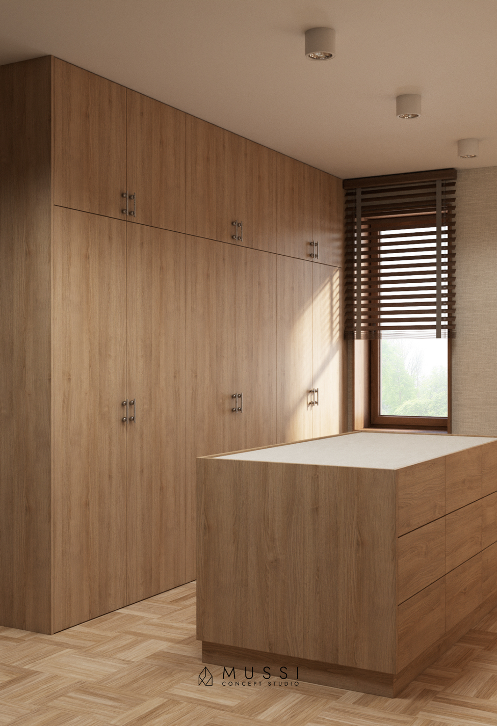 Fundamentem tego projektu jest szacunek do historii budynku i bezwzględna szczerość materiałów. W 20-letnim domu, zamiast wymiany podłogi, zdecydowaliśmy się na gruntowną renowację oryginalnego dębowego parkietu. Odświeżone drewno zyskało drugie życie, udowadniając, że naturalny surowiec szlachetnie się starzeje i stanowi doskonałą bazę dla nowoczesnych aranżacji. Tę klasyczną podłogę zestawiliśmy z nowymi, luksusowymi fakturami: dostojnym orzechem amerykańskim w zabudowach oraz zjawiskowym naturalnym kwarcytem Taj Mahal. Kamień o niepowtarzalnym użyleniu zdobi blaty i wyspę kuchenną, wprowadzając do odnowionego wnętrza powiew współczesnego luksusu.