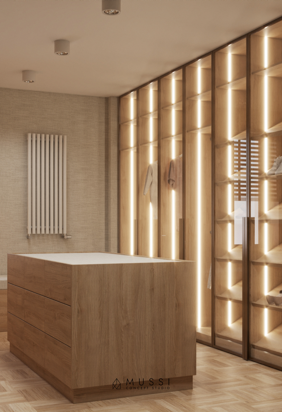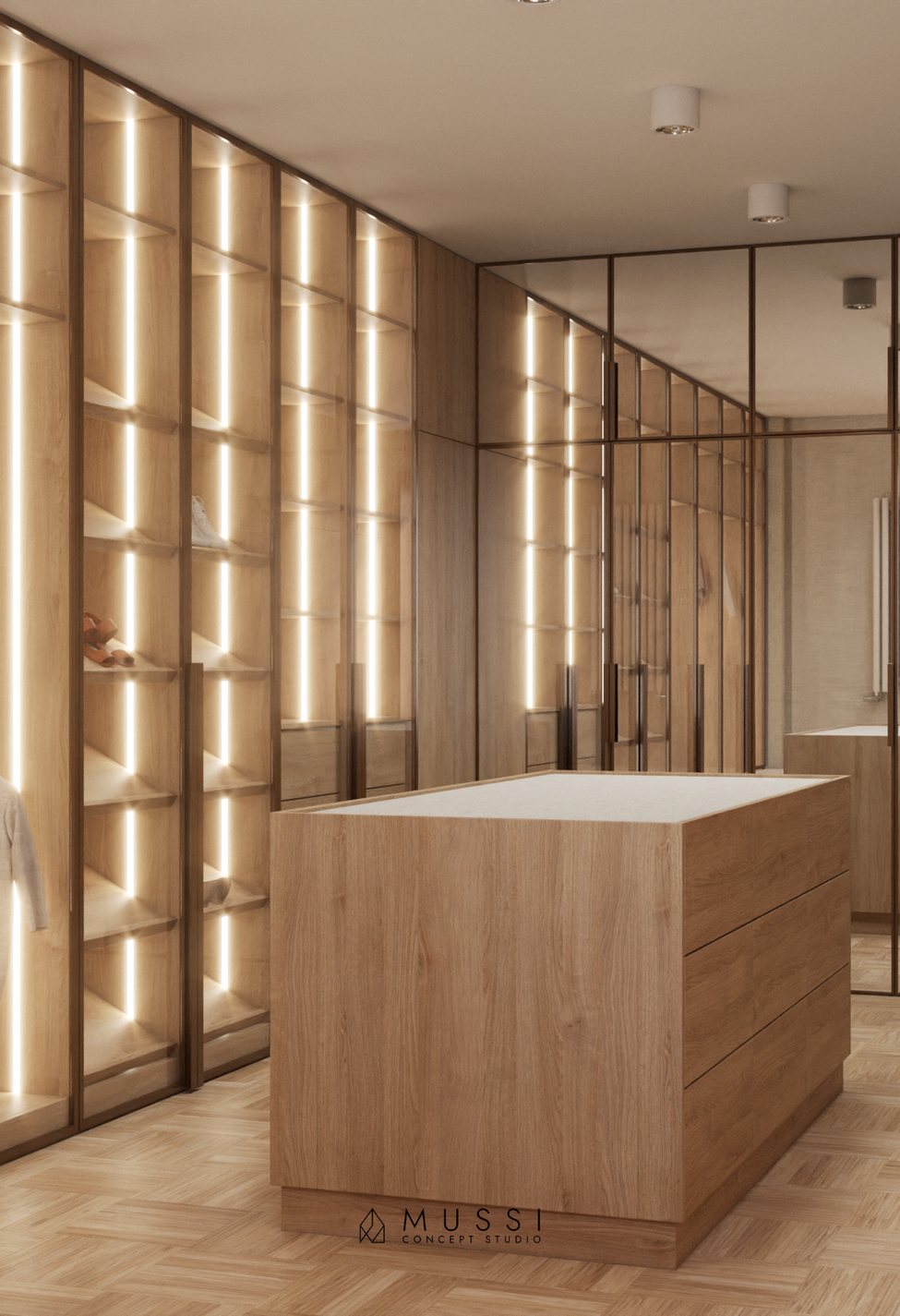 Metraż 330 m² pozwolił na stworzenie układu funkcjonalnego, który nie uznaje kompromisów. Otwarta strefa dzienna z imponującą kuchnią i przeszklonymi witrynami płynnie przechodzi w strefę wypoczynku, zachęcając do celebrowania wspólnych chwil. W sypialni master postawiliśmy na rozwiązania w typie hotelowym – zintegrowana toaletka, obszerne szafy i miękkie wykończenia tworzą prywatną strefę relaksu. To dom, w którym nowoczesny design służy ergonomii, a każdy metr kwadratowy został zaprojektowany z szacunkiem dla potrzeb mieszkańców.