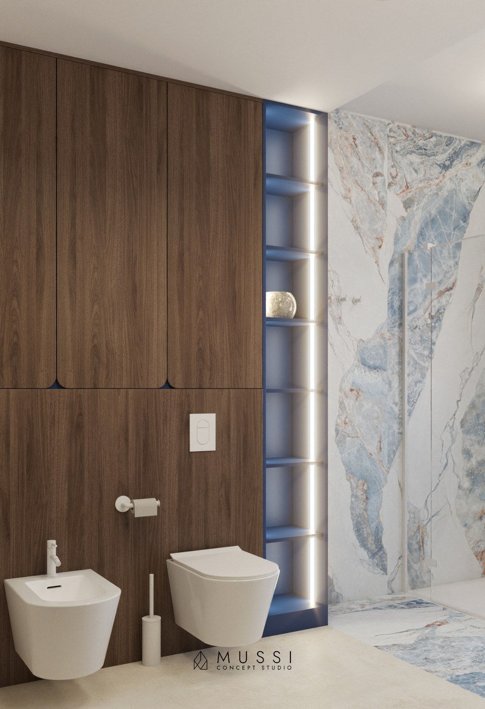 W tak spójnym projekcie pozwoliliśmy sobie na jedno odstępstwo od reguły, tworząc przestrzeń pełną energii i fantazji. Łazienka córki to stylistyczna niespodzianka – królują tu wielkoformatowe spieki kwarcowe o wzorze błękitnego onyksu. Zestawione z mocnymi, chabrowymi akcentami w zabudowie meblowej i designerskim grzejnikiem, tworzą wnętrze świeże, nowoczesne i odważne, które wyraźnie odcina się od stonowanej reszty domu, podkreślając indywidualizm jego użytkowniczki.