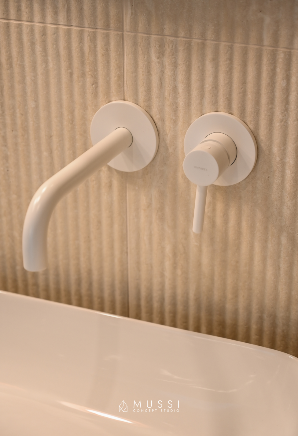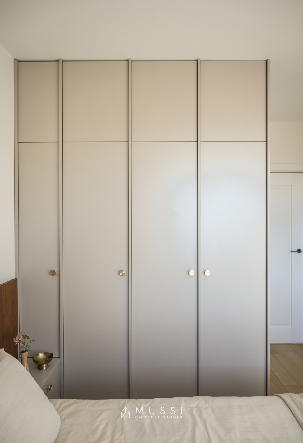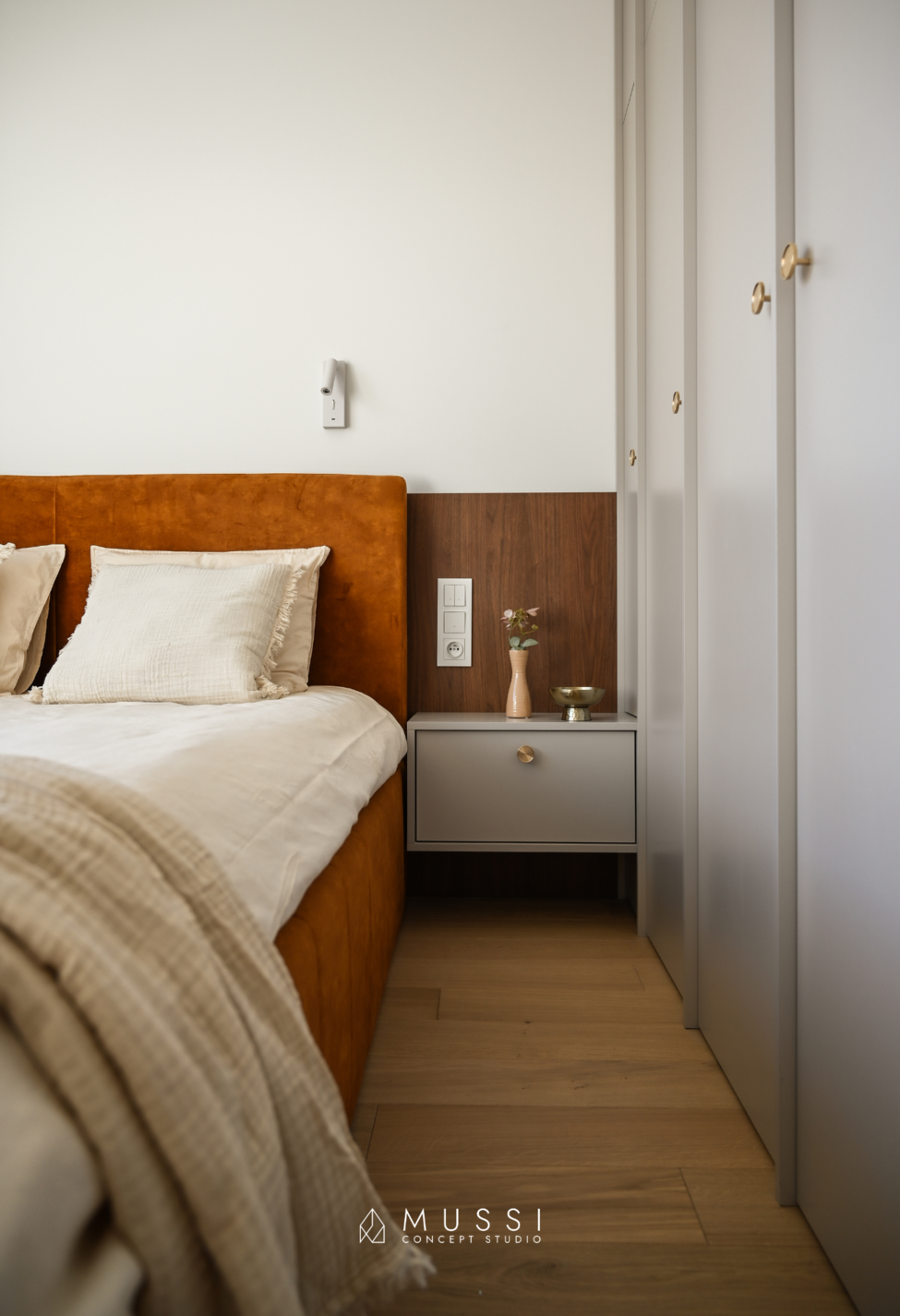W projekcie zastosowaliśmy ograniczoną paletę barw – biel, kaszmir oraz wykończenia mebli w orzechu amerykańskim. Kolorystyka ta została dobrana w sposób neutralny, ułatwiający odpoczynek i niewymagający częstej aktualizacji pod względem estetycznym. Użycie orzecha amerykańskiego pozwoliło również wprowadzić naturalny akcent i ocieplić wnętrze bez potrzeby wprowadzania dodatkowych dekoracji.