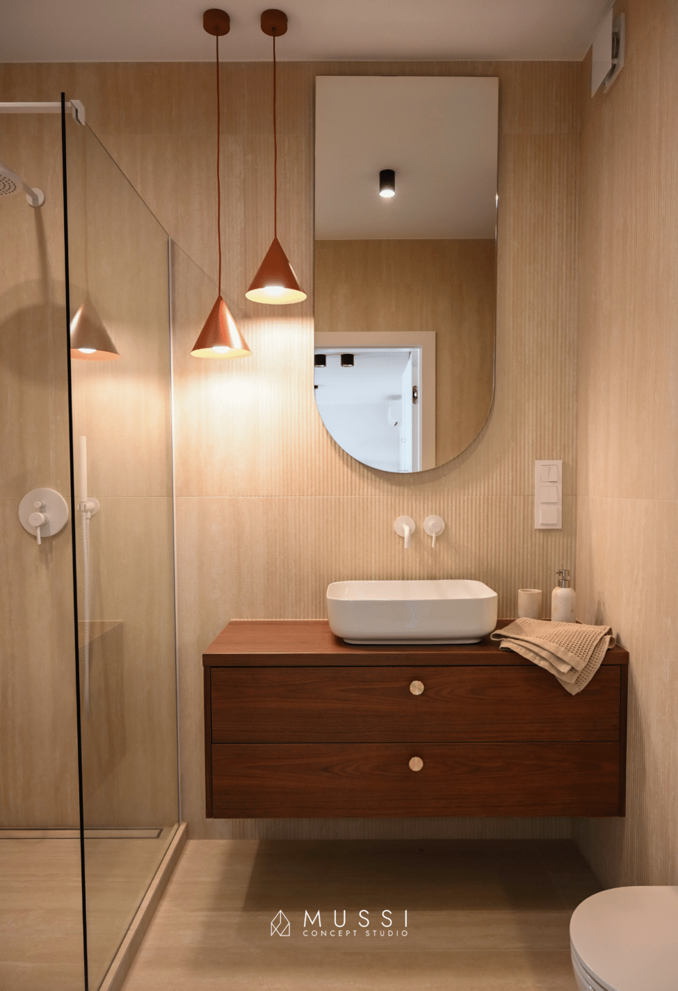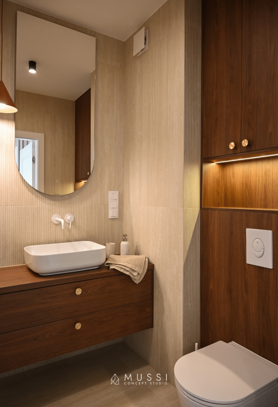 Łazienka została zaprojektowana w układzie liniowym – z kabiną prysznicową typu walk-in oraz umywalką nablatową z szafką. Aby nie zagracać niewielkiej przestrzeni sanitarnej, pralka została przeniesiona do zabudowy meblowej w korytarzu. Umieszczenie jej w wysokiej szafie pozwoliło zachować czystość i porządek w łazience, jednocześnie zapewniając łatwy dostęp do urządzenia.