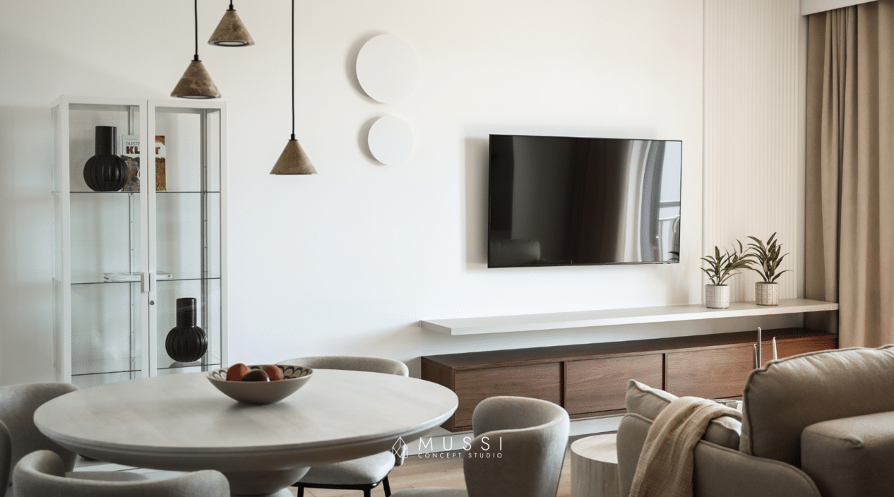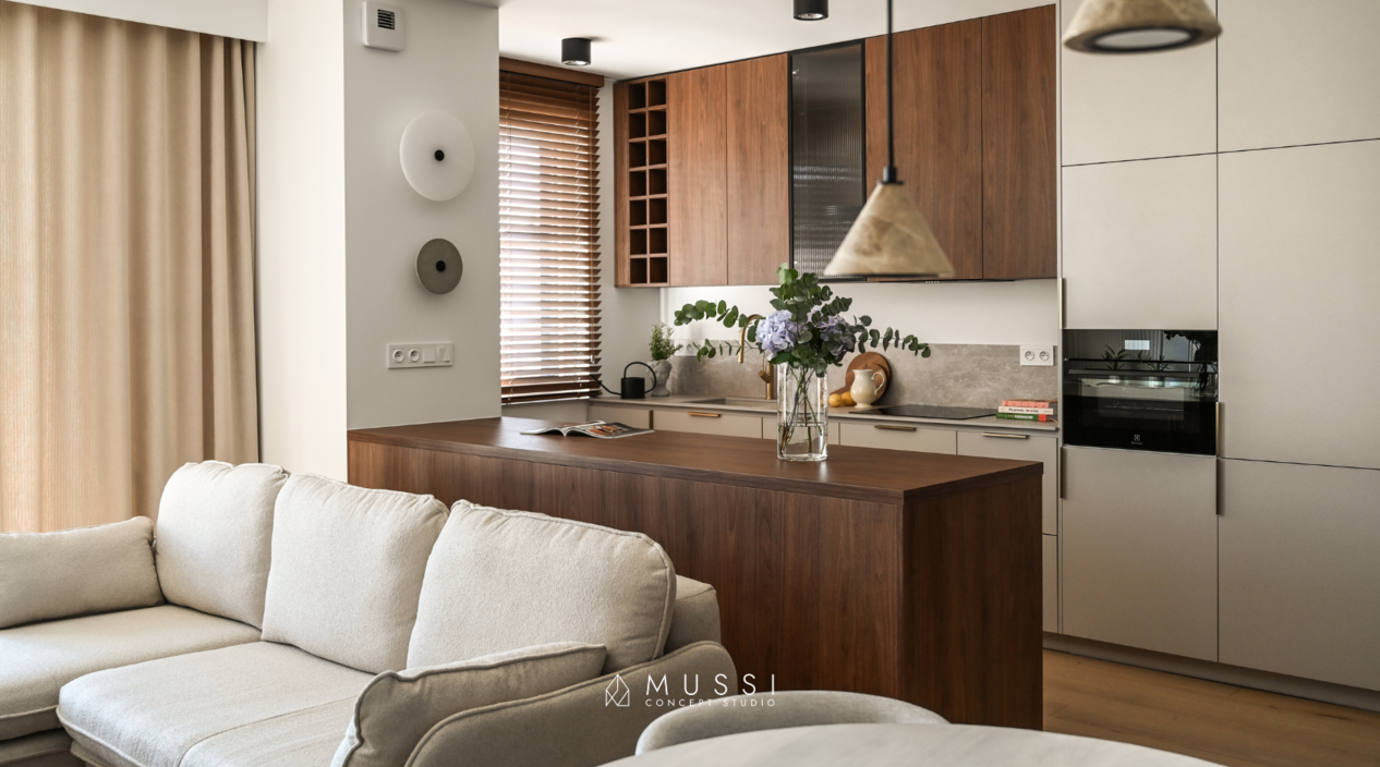 Mieszkanie zostało zaprojektowane jako przestrzeń kompaktowa, ale w pełni wyposażona. Część dzienna łączy funkcję salonu, jadalni oraz aneksu kuchennego. Aneks kuchenny zaplanowałem w zabudowie liniowej, z pełnowymiarowymi sprzętami AGD oraz wysokimi szafkami zapewniającymi maksymalną ilość miejsca do przechowywania. Dodatkowym elementem kuchni jest półwysep, który pełni funkcję pomocniczego blatu roboczego, a jednocześnie stanowi fizyczne i funkcjonalne rozdzielenie strefy kuchennej od części dziennej. Półwysep wyposażono także w dolne szafki, co dodatkowo zwiększa przestrzeń magazynową, szczególnie istotną w mieszkaniu o charakterze tymczasowym.