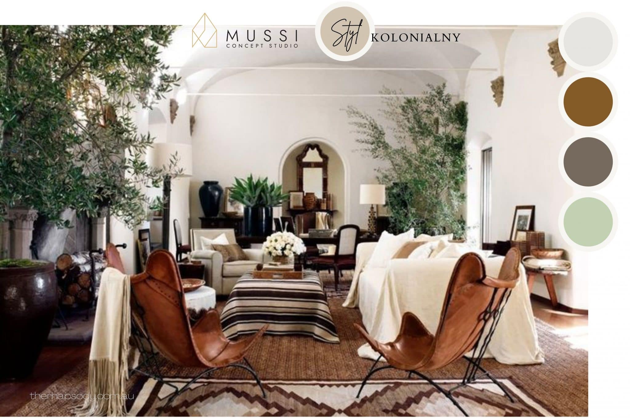 Podstawą każdego wnętrza jest kolor ścian oraz podłoga, które tworzą podkład dla dalszych zabiegów aranżacyjnych. Należy zadbać, aby były one odpowiednim tłem dla mebli kolonialnych – nie powinny z nimi konkurować. To meble stanowią centrum aranżacji, dlatego należy je odpowiednio wyeksponować. W salonie, w którym najlepiej można ukazać pełną krasę stylu, pojawi się sofa, wygodne fotele, stolik kawowy i witryny ekspozycyjne. Ściany ozdobione stonowaną tapetą, dużym kilimem lub obrazem, a także sofa z dekoracyjnymi poduszkami – każdy element powinien składać się na harmonijną całość.